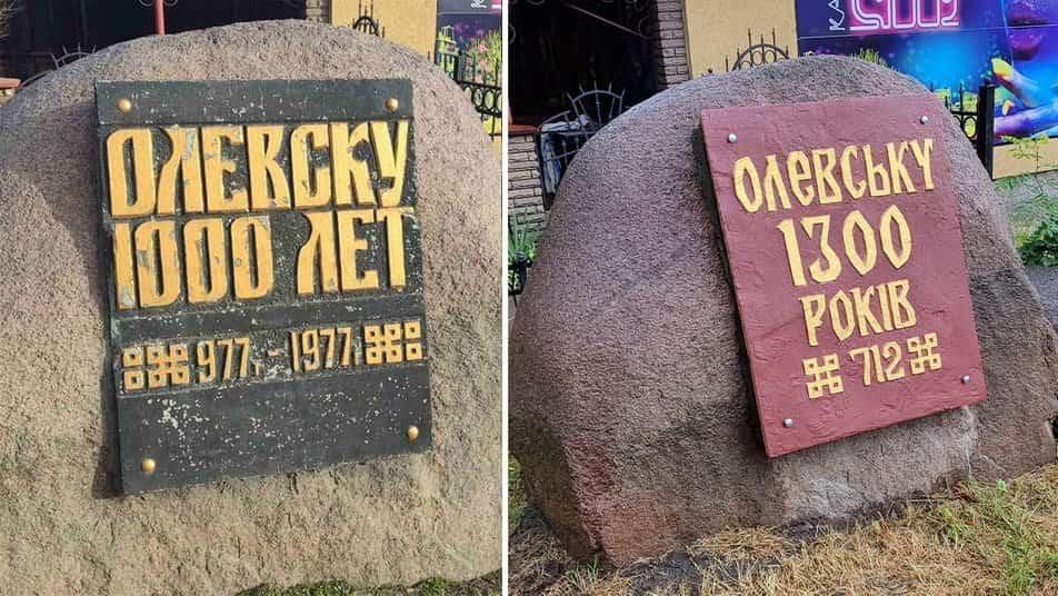 В Олевську на пам’ятному знаку замінили плиту з російськомовним написом "Олевску 1000 лет" на україномовний напис "Олевську 1300 років". Рішення про те, в якому вигляді встановлювати оновлену кам’яну брилу, приймали члени координаційної ради.