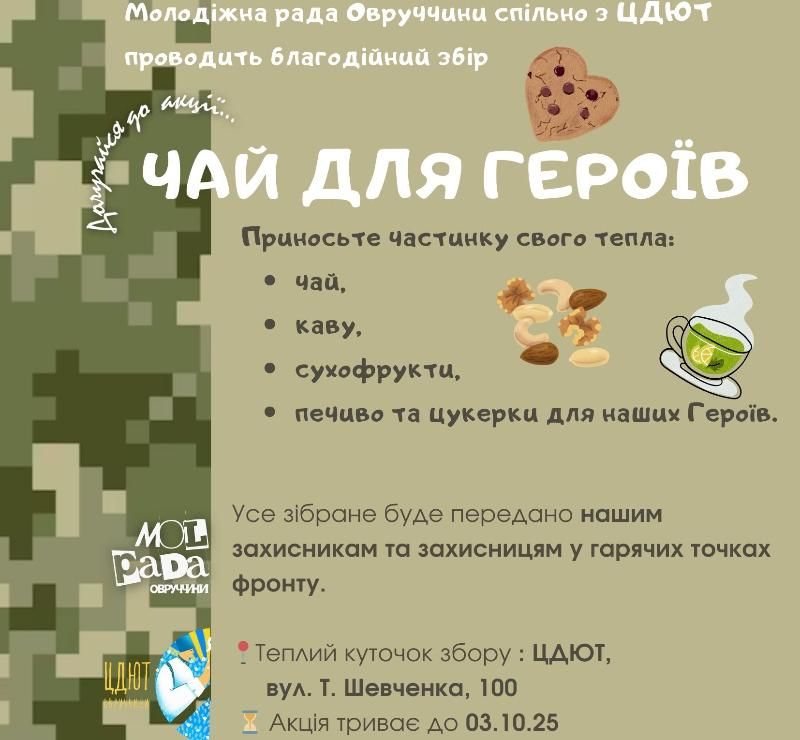 На Овруччині молодіжна рада спільно з ЦДЮТ до Дня захисників і захисниць України оголошує благодійний збір смаколиків для наших захисників.