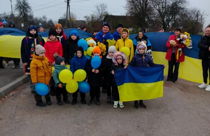 Сільські діти бігли до свого захисника із синьо-жовтими повітряними кульками, квітами та прапорами, дякуючи йому за мир і спокій.